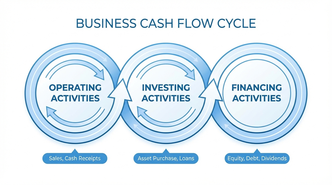 TL;DR: A cash flow statement tracks the actual movement of cash in and out of a business through three key categories: operating activities (daily business operations), investing activities (asset purchases and sales), and financing activities (debt and equity transactions). Unlike profit calculations, it shows real cash availability, helping businesses manage liquidity and investors evaluate financial health.