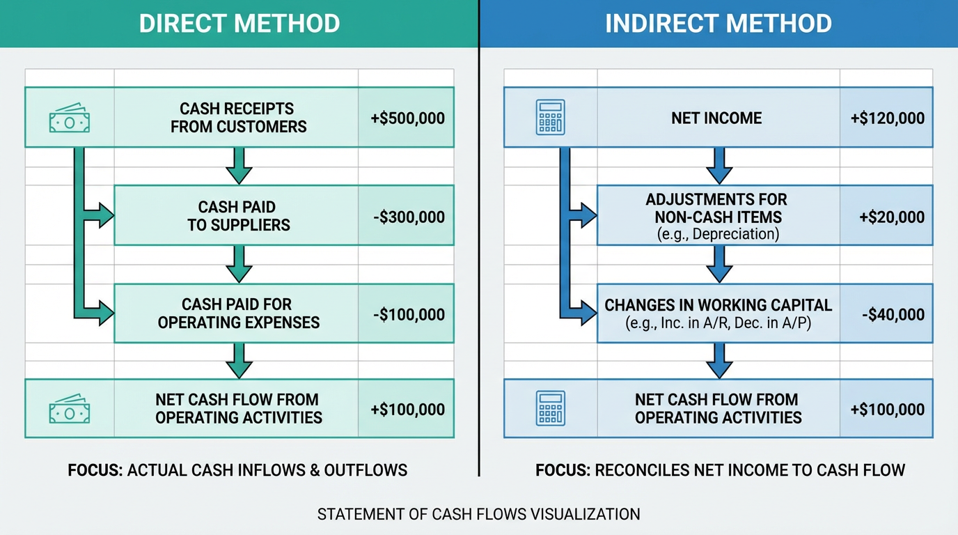 The direct method lists all major categories of gross cash receipts and payments, including cash received from customers, cash paid to suppliers, operating expenses, interest and taxes. According to Harvard Business School Online, this approach provides more transparent information about cash sources and uses, though most companies prefer the indirect method because it requires less detailed record-keeping.