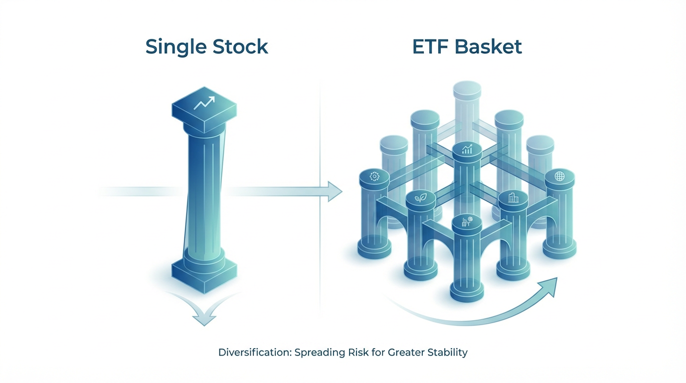 The primary advantage of ETFs is instant portfolio diversification. When you buy a broad-market ETF, you spread your investment across many companies, sectors, and countries. If one company underperforms, others in the basket buffer its impact. This is valuable for beginners who lack experience to assess individual company risks or capital to build a diversified stock portfolio.