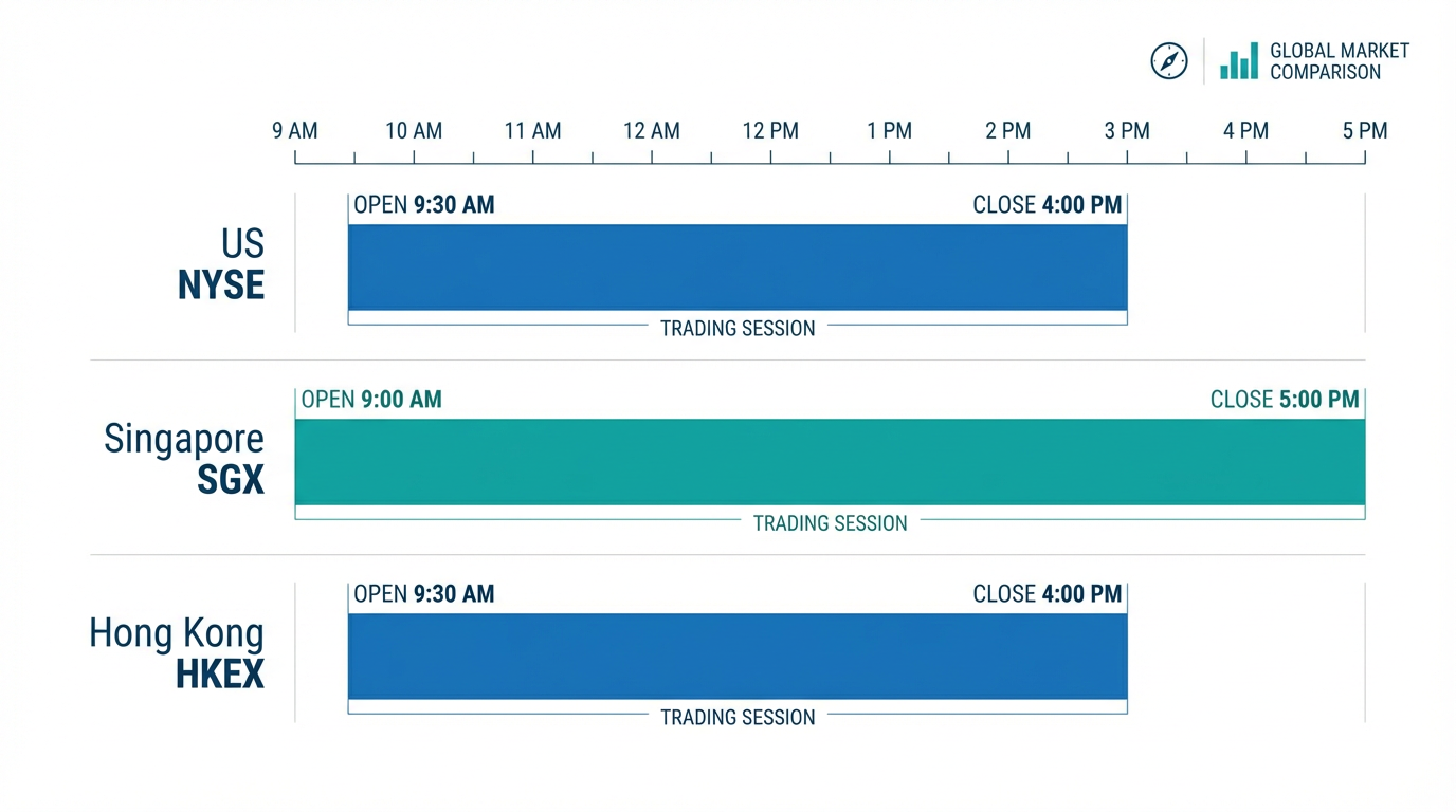 TL;DR: ETF trading hours vary across markets: the US trades from 9:30 AM to 4:00 PM Eastern Time (9:30 PM to 4:00 AM Singapore Time), Singapore's SGX operates 9:00 AM to 5:00 PM SGT with a lunch break, and Hong Kong's HKEX runs 9:30 AM to 4:00 PM HKT with a midday break. Understanding these schedules helps Singapore investors time their trades effectively across multiple markets.