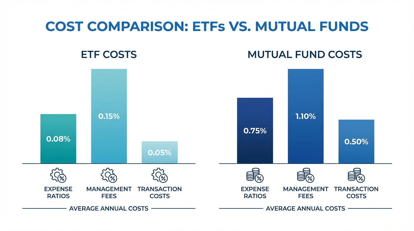This difference stems from the management approach. ETFs predominantly use passive index-tracking strategies requiring minimal ongoing management, while actively managed mutual funds employ teams of analysts and portfolio managers.