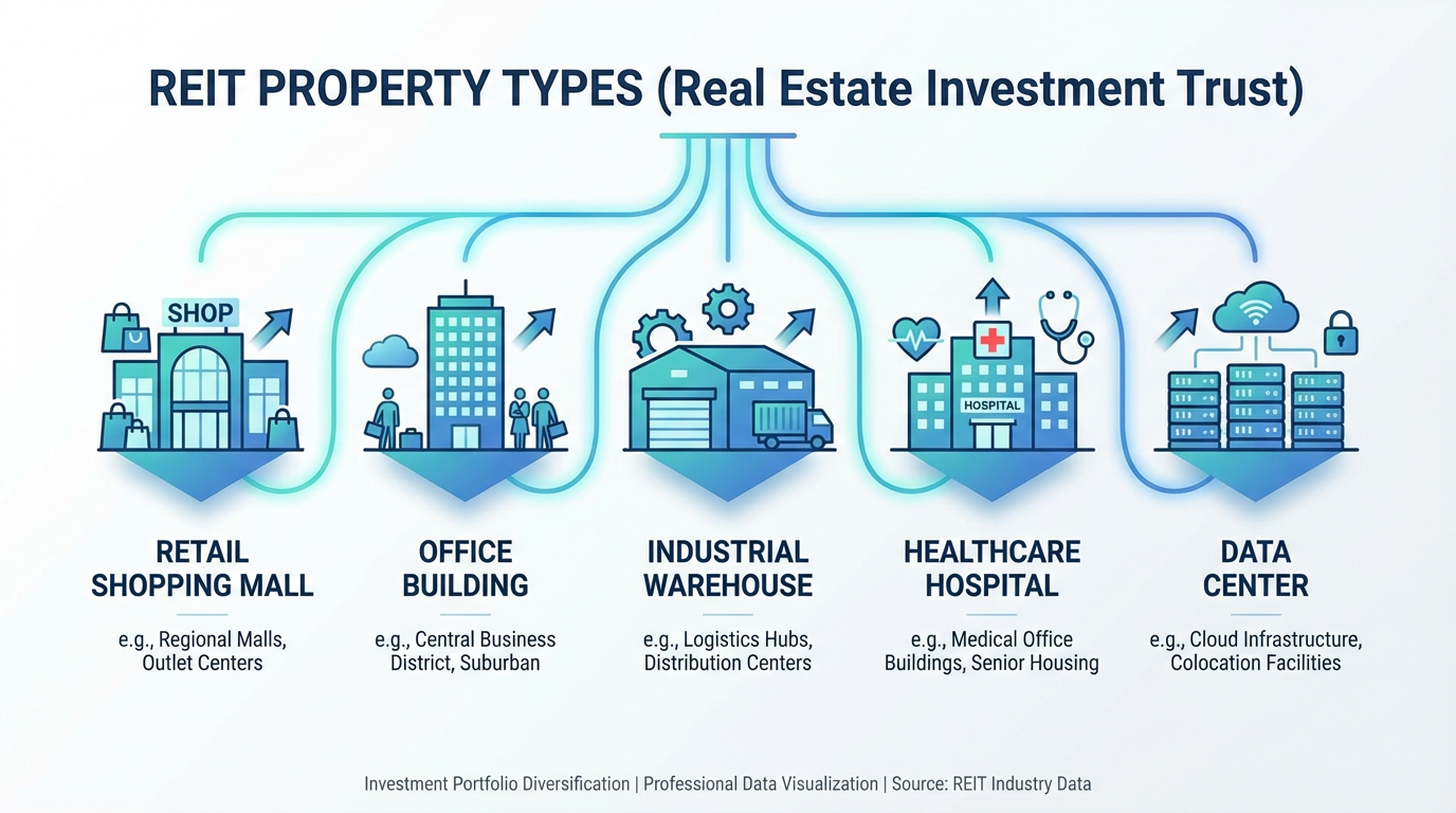 Some REITs hold mixed portfolios spanning multiple property types, offering built-in diversification across sectors.