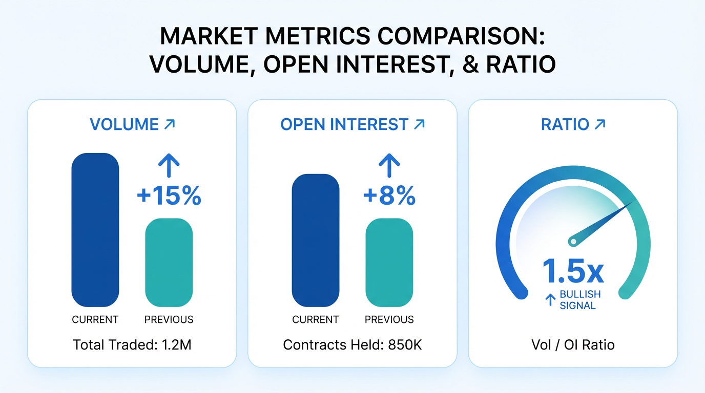 The volume-to-open interest ratio measures how many contracts are trading compared to the total outstanding contracts. A high ratio indicates new positions are being opened rather than existing positions being closed. When daily volume exceeds open interest, it may suggest significant new money is entering that particular contract.