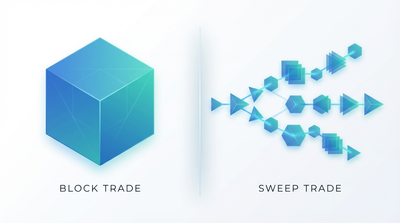 Sweep trades are a series of smaller orders executed nearly simultaneously across multiple exchanges. Traders use sweeps when they want to fill a large order quickly without moving the market significantly. Sweep trades can indicate urgency, as the trader is willing to pay varying prices across exchanges to complete their position rapidly.