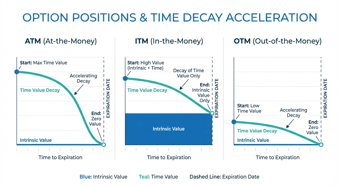 Time decay does not progress linearly. Options lose value slowly when expiration sits months away but shed premium rapidly in the final weeks. At-the-money (ATM) options particularly experience sharp acceleration as expiration approaches, with theta increasing dramatically in the last 30 days. This acceleration creates a critical planning consideration for option buyers. Many experienced traders avoid buying options inside this window unless anticipating immediate, substantial price movement.