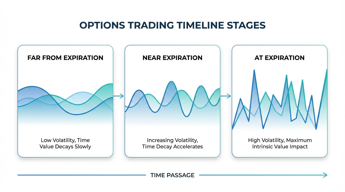 An option with two weeks until expiration behaves very differently from the same strike with two days remaining, even at identical stock prices. This calendar effect becomes critical when rolling positions, as moving from short-dated to longer-dated options dramatically changes gamma exposure.