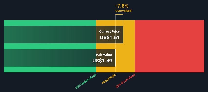 The total value, or equity value, is then the sum of the present value of the future cash flows, which in this case is US$6.6m. To get the intrinsic value per share, we divide this by the total number of shares outstanding. Relative to the current share price of US$1.6, the company appears around fair value at the time of writing. Remember though, that this is just an approximate valuation, and like any complex formula - garbage in, garbage out.