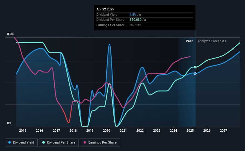 The company has a long dividend track record, but it doesn't look great with cuts in the past. The annual payment during the last 10 years was SGD0.0425 in 2015, and the most recent fiscal year payment was SGD0.03. This works out to be a decline of approximately 3.4% per year over that time. Generally, we don't like to see a dividend that has been declining over time as this can degrade shareholders' returns and indicate that the company may be running into problems.