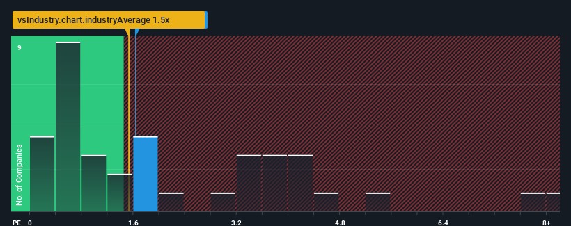 Although its price has surged higher, it's still not a stretch to say that Pavillon Holdings' price-to-sales (or "P/S") ratio of 1.6x right now seems quite "middle-of-the-road" compared to the Hospitality industry in Singapore, where the median P/S ratio is around 1.5x. While this might not raise any eyebrows, if the P/S ratio is not justified investors could be missing out on a potential opportunity or ignoring looming disappointment.