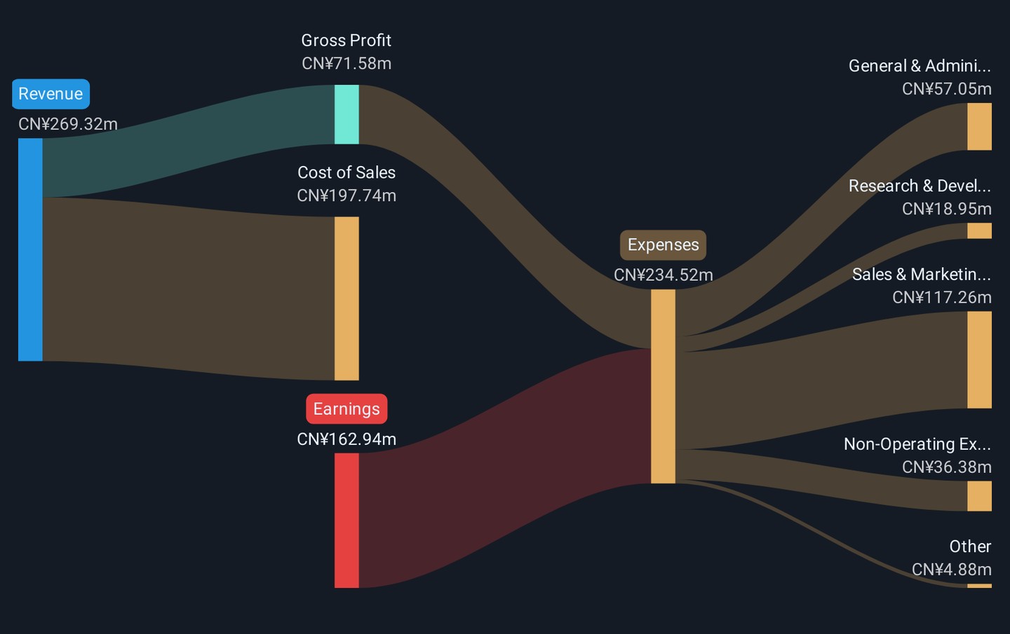 Qinghai Spring Medicinal Resources Technology, with a market cap of CN¥2.49 billion, shows signs of financial improvement despite its unprofitable status over recent years. The company reported a net income of CN¥8.92 million for Q1 2025, contrasting with a loss the previous year, and annual revenue growth from CN¥213.88 million to CN¥270.26 million in 2024. Its strong cash position covers both short-term liabilities (CN¥70.9M) and long-term liabilities (CN¥2.9M), while remaining debt-free enhances financial stability amidst volatility in earnings and negative return on equity (-15.54%). Management's experience further supports potential operational resilience.