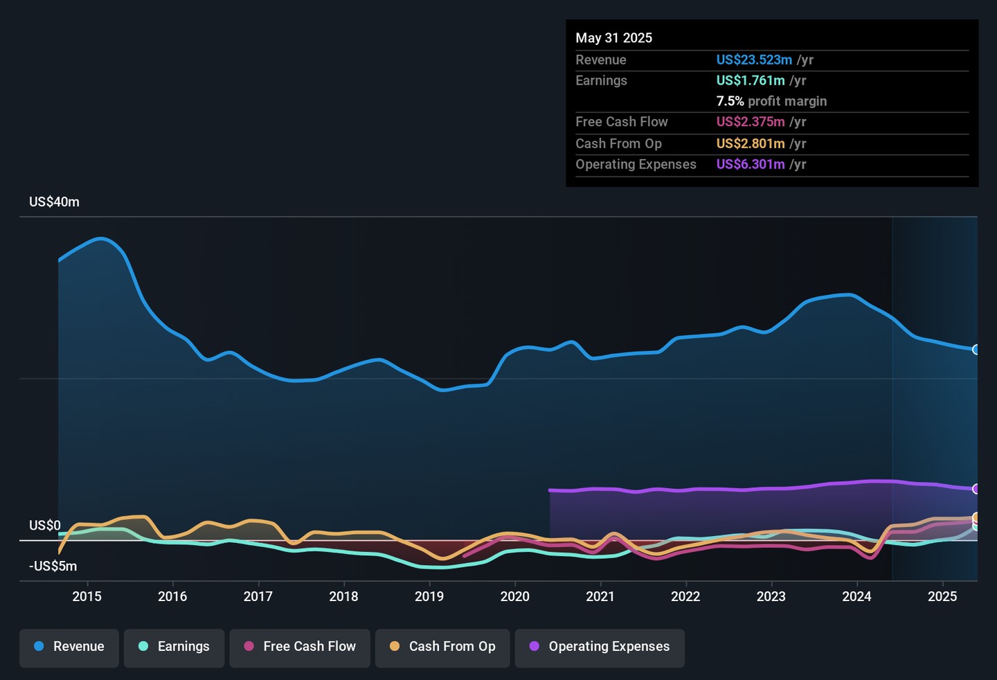Art's-Way Manufacturing (NASDAQ:ARTW) reported its Second Quarter 2025 earnings with an EPS of US$0.29, a significant improvement from a loss of US$0.001 in 2Q 2024. Revenue decreased by 5.8% to US$6.34 million, but net income rose to US$1.48 million from a loss of US$4.7k in the previous year, attributed to lower expenses. The profit margin increased to 23%. However, shares have declined by 4.2% over the past week, and there is one identified warning sign for the company.