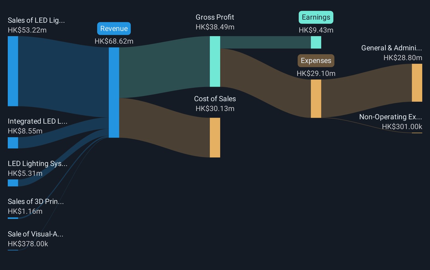 IMS Group Holdings (HKG:8136) reported a decline in its Full Year 2025 earnings, with EPS at HK$0.009, down from HK$0.015 in FY 2024. Revenue fell 20% to HK$68.6m, and net income decreased by 39% to HK$9.43m, resulting in a profit margin drop from 18% to 14%. The LED Lighting and Fixtures segment was the primary revenue driver, while General & Administrative costs were the largest expense. Despite these challenges, shares rose 6.8% over the past week. One warning sign has been identified for investors.