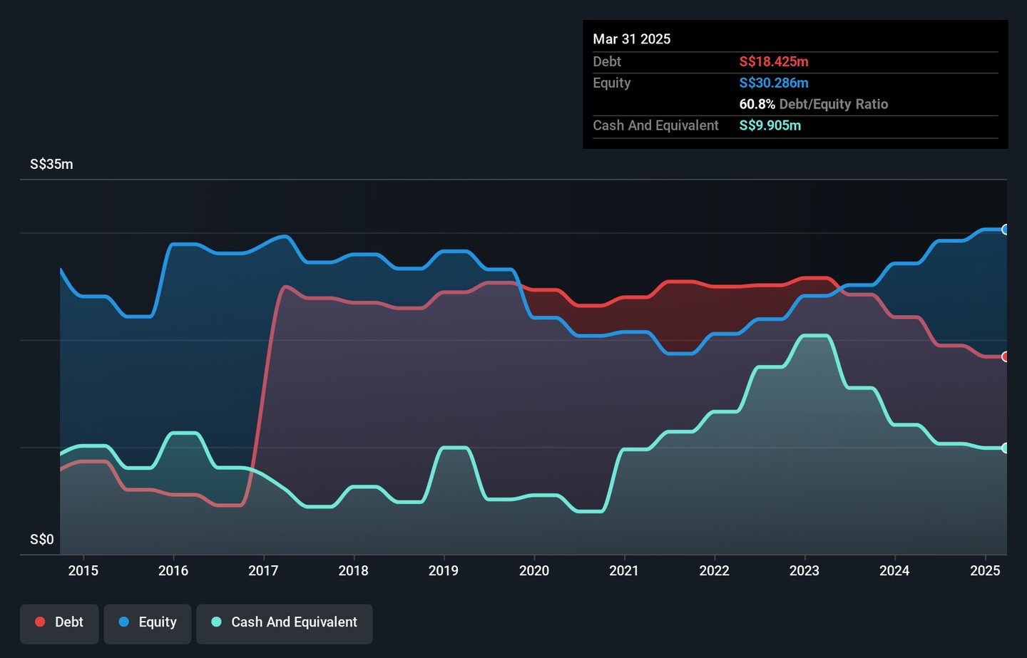 As you can see below, Travelite Holdings had S$18.4m of debt at March 2025, down from S$22.1m a year prior. However, it does have S$9.91m in cash offsetting this, leading to net debt of about S$8.52m.