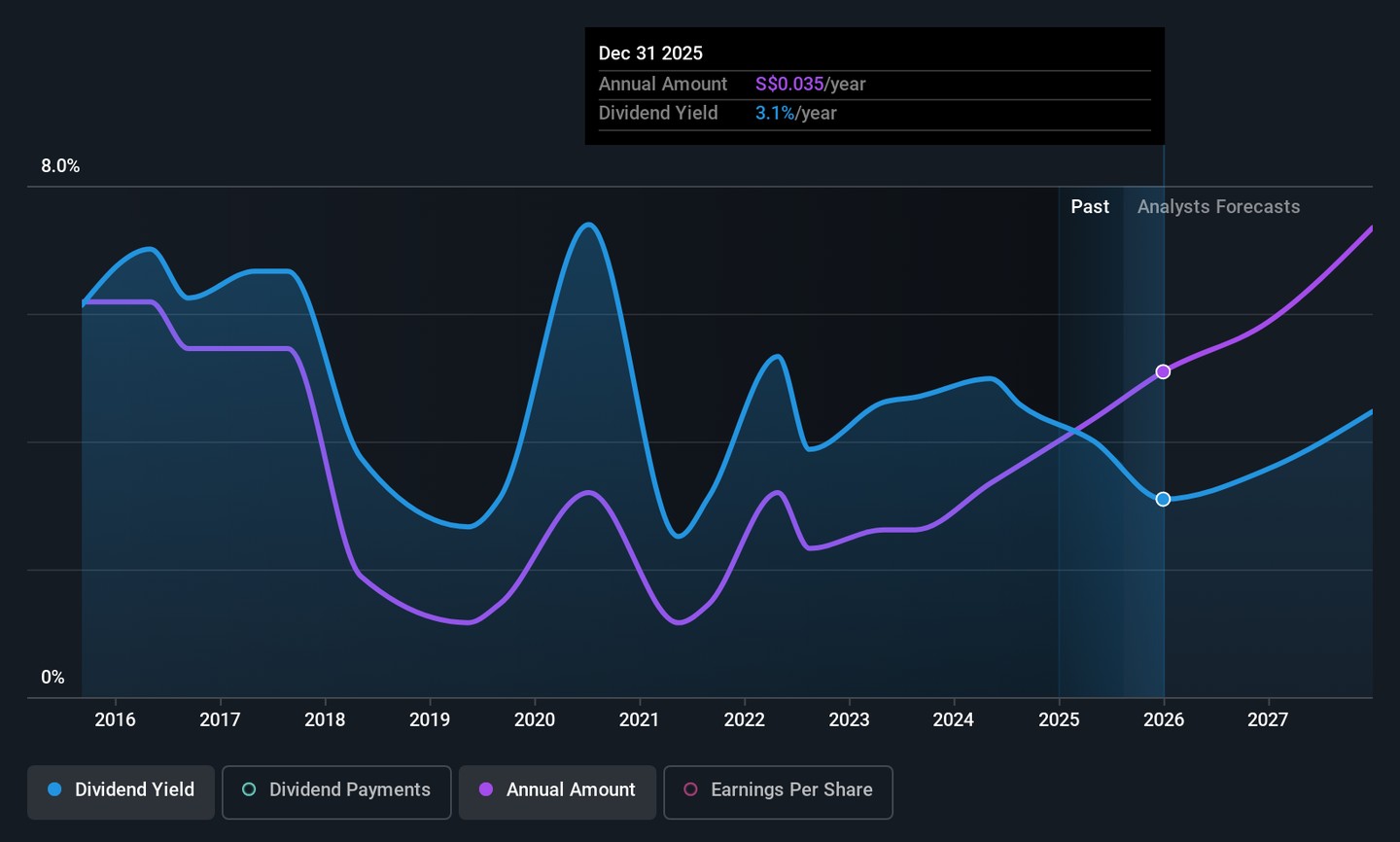 The company has a long dividend track record, but it doesn't look great with cuts in the past. The dividend has gone from an annual total of SGD0.0425 in 2015 to the most recent total annual payment of SGD0.03. The dividend has shrunk at around 3.4% a year during that period. Declining dividends isn't generally what we look for as they can indicate that the company is running into some challenges.