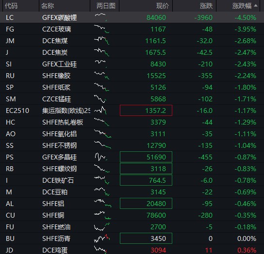 Commodities: Domestic commodity futures generally declined. As of the time of writing, lithium carbonate fell over 4%, glass fell nearly 4%, coking coal, coke, industrial silicon, and rubber fell over 2%. Pulp, manganese silicon, the shipping index, hot-rolled sheets, alumina, and stainless steel fell over 1%. Polysilicon, rebar, iron ore, soybean meal, aluminum, copper, and fuel oil also declined, while eggs saw a slight increase.