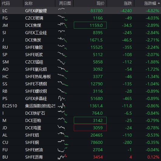 Most commodity futures opened lower, with soda ash and glass main contracts falling over 4%, BR rubber and coking coal down over 3%, and coke, lithium carbonate, No. 20 rubber, and rubber down over 2%. Soybean meal, pulp, palm oil, polysilicon, manganese silicon, Shanghai silver, and alumina all fell over 1%.