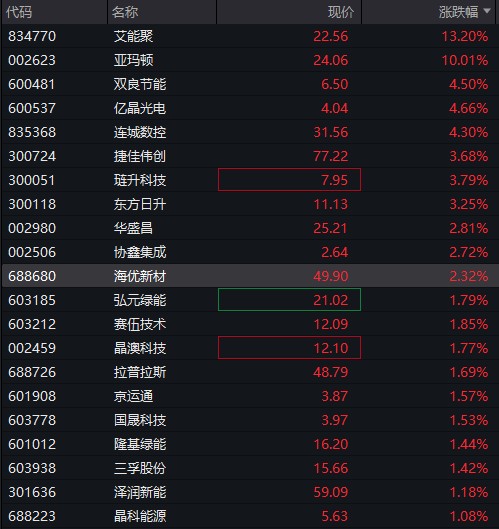 The photovoltaic sector opened actively, with Huamin shares hitting the limit up, Ainoju rising over 10%, and Yamaton, Hongyuan Green Energy, Haiyou New Materials, and Jing'ao Technology among several stocks opening high.