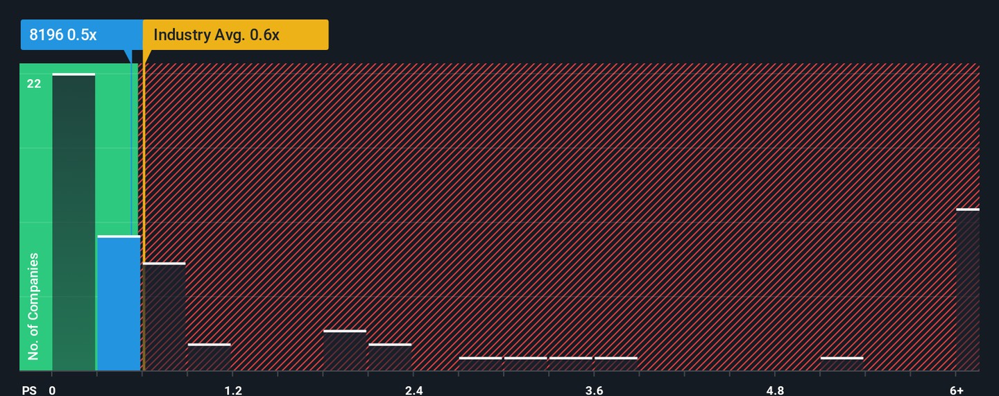 It's not a stretch to say that Futian Holdings Limited's (HKG:8196) price-to-sales (or "P/S") ratio of 0.5x right now seems quite "middle-of-the-road" for companies in the Trade Distributors industry in Hong Kong, where the median P/S ratio is around 0.6x. Although, it's not wise to simply ignore the P/S without explanation as investors may be disregarding a distinct opportunity or a costly mistake.