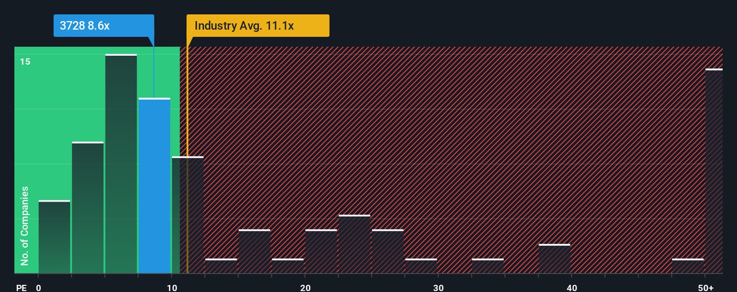 In spite of the firm bounce in price, Ching Lee Holdings may still be sending bullish signals at the moment with its price-to-earnings (or "P/E") ratio of 8.6x, since almost half of all companies in Hong Kong have P/E ratios greater than 13x and even P/E's higher than 25x are not unusual. Although, it's not wise to just take the P/E at face value as there may be an explanation why it's limited.