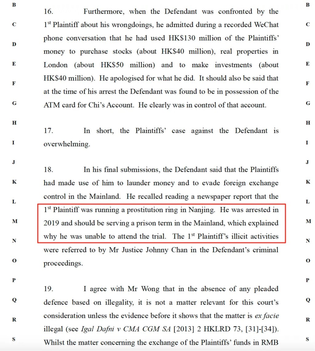 It is worth noting that the judgment shows that the victim and plaintiff, Yu Quanli, and his wife, Lou Xiaojie, are not ordinary people. The Hong Kong court explicitly pointed out in the judgment that the 130 million yuan used by Yu Quanli for the transfer "most likely comes from organized illegal prostitution activities," and Sun Jianrong, as a professional financial advisor, "should have been aware of the illegality of the funds."
