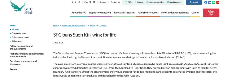Recently, the Hong Kong Securities and Futures Commission disclosed that former UBS AG deputy director Sun Jianrong was convicted of money laundering and contempt of court for embezzling over HKD 130 million from mainland clients under the guise of "assisting with cross-border remittances" and lavishly spending it. He was sentenced to a total of ten years and six months in prison; the Hong Kong Securities and Futures Commission also announced a lifetime ban on Sun Jianrong from re-entering the financial industry.