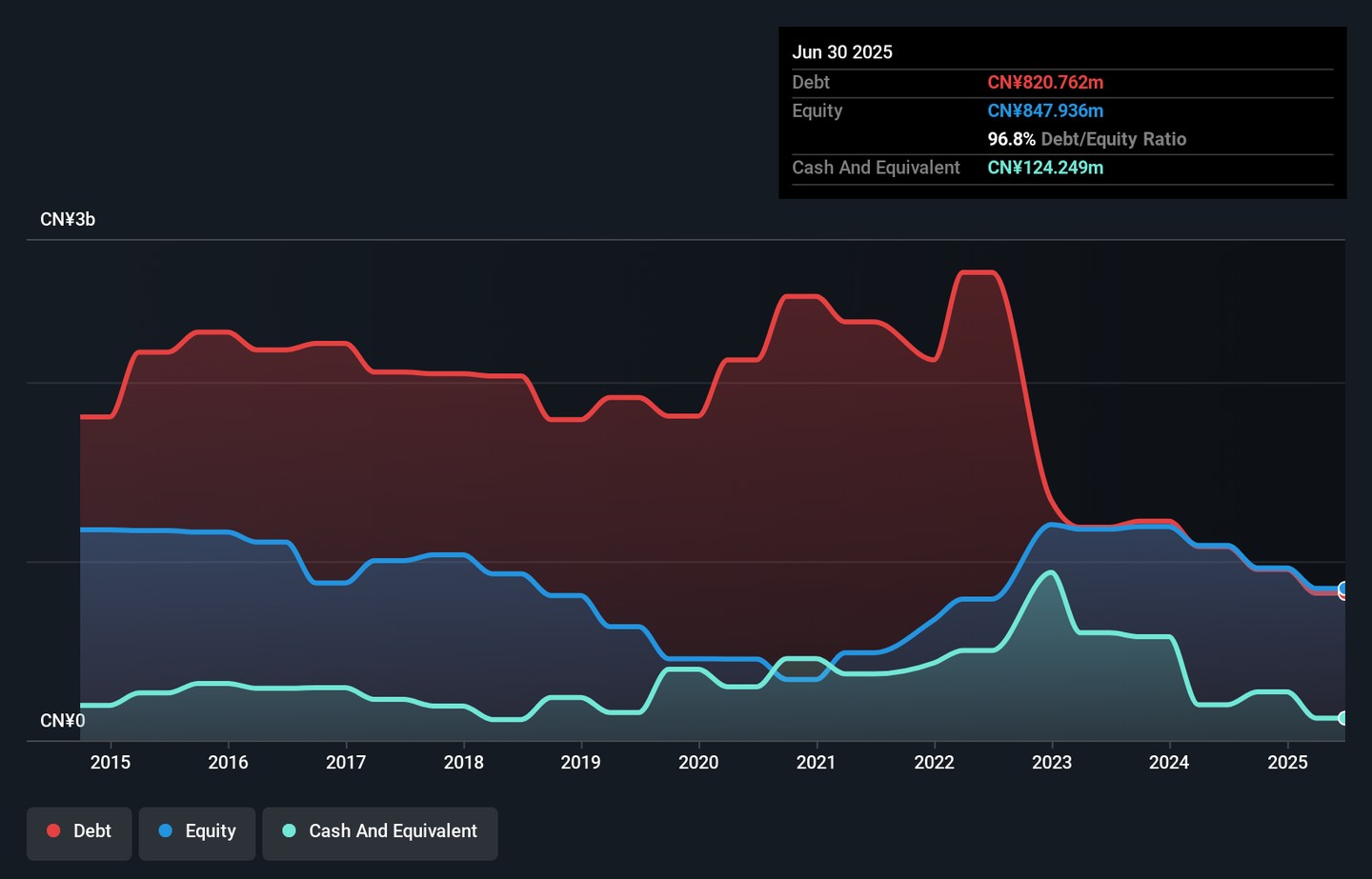 The image below, which you can click on for greater detail, shows that Solargiga Energy Holdings had debt of CN¥820.8m at the end of June 2025, a reduction from CN¥1.08b over a year. However, it also had CN¥124.2m in cash, and so its net debt is CN¥696.5m.