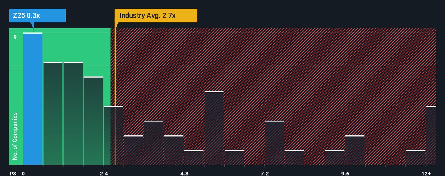 Yanlord Land Group Limited (SGX:Z25) shares have surged 25% in the last month and 78% over the past year. Despite this, the company's low price-to-sales (P/S) ratio of 0.3x raises concerns, as revenue has declined 47% in the past year and is expected to drop another 14% next year. This poor revenue performance contributes to the subdued P/S, indicating that investors are cautious about future growth. Analysts suggest that without improvement in revenue, the stock may not be seen as a good value, and the share price may struggle to rise further.