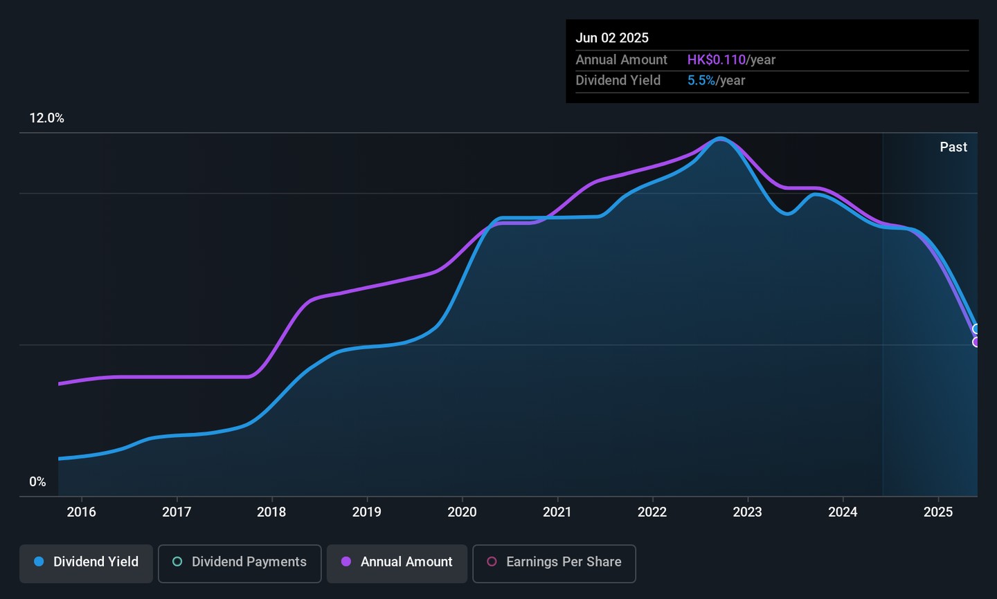 The company's next dividend payment will be HK$0.025 per share. Last year, in total, the company distributed HK$0.11 to shareholders. Based on the last year's worth of payments, APT Satellite Holdings stock has a trailing yield of around 5.2% on the current share price of HK$2.13. If you buy this business for its dividend, you should have an idea of whether APT Satellite Holdings's dividend is reliable and sustainable. We need to see whether the dividend is covered by earnings and if it's growing.