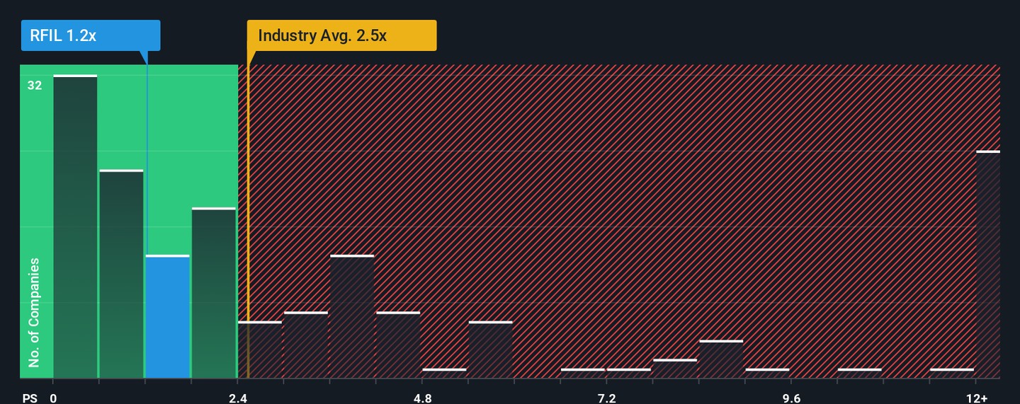 Even after such a large jump in price, RF Industries may still be sending bullish signals at the moment with its price-to-sales (or "P/S") ratio of 1.2x, since almost half of all companies in the Electronic industry in the United States have P/S ratios greater than 2.5x and even P/S higher than 6x are not unusual. However, the P/S might be low for a reason and it requires further investigation to determine if it's justified.