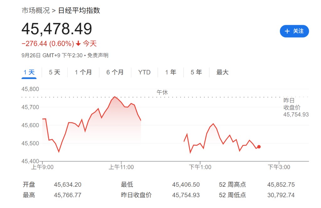 On Friday, the Nikkei 225 index in Japan fell about 0.6%, closing at 45,478 points. Under the direct threat of a 100% drug tariff, Japanese pharmaceutical stocks saw significant declines, with Sumitomo Pharma's stock price dropping 5.2% and Chugai Pharmaceutical down 3.9%.