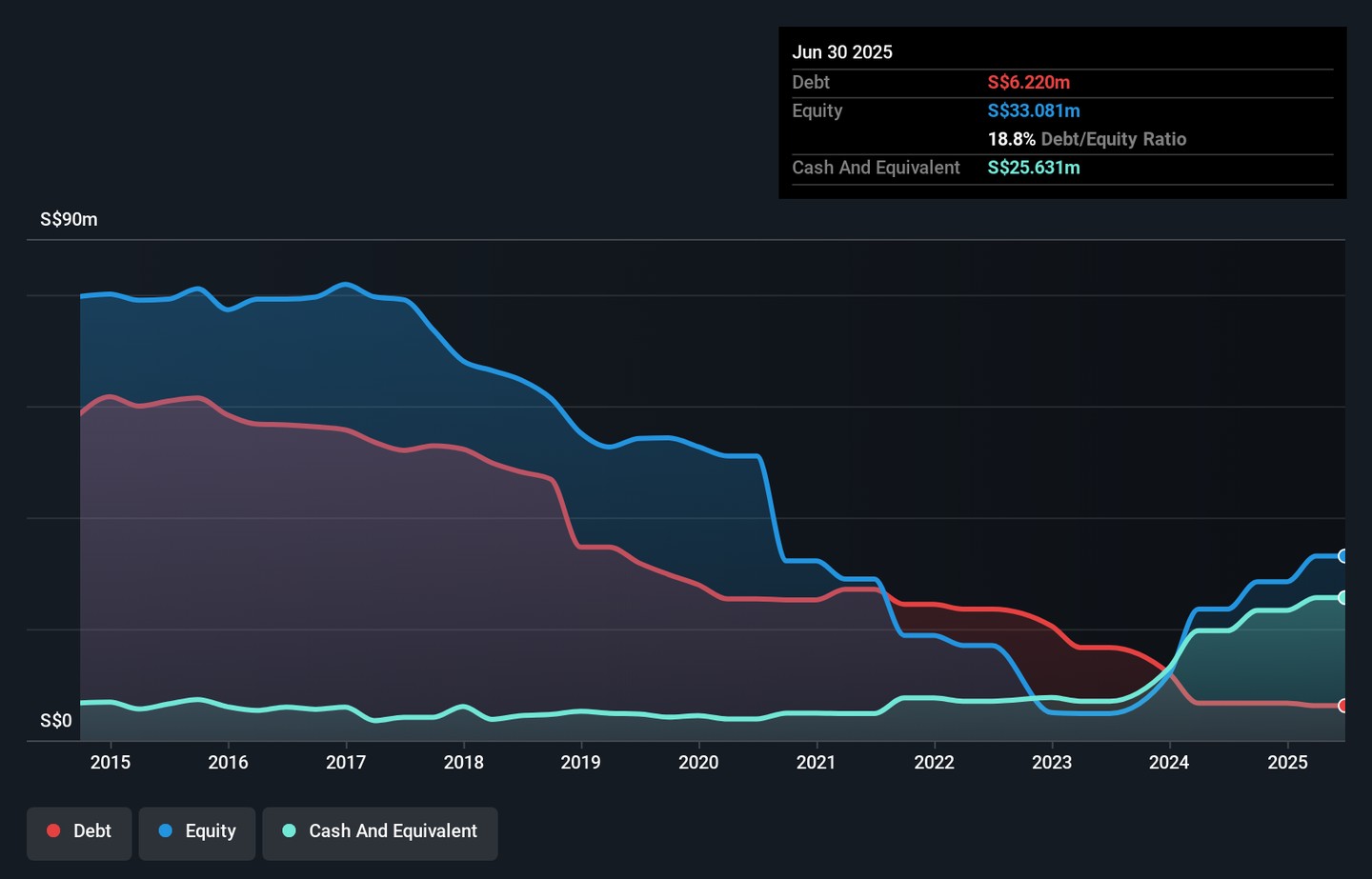 The image below, which you can click on for greater detail, shows that Beng Kuang Marine had debt of S$6.22m at the end of June 2025, a reduction from S$6.66m over a year. However, it does have S$25.6m in cash offsetting this, leading to net cash of S$19.4m.