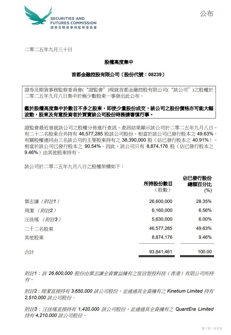 The Hong Kong Securities and Futures Commission stated that it recently conducted an inquiry into the equity distribution of CAPITAL FIN. The inquiry results showed that as of September 8, 2025, 22 shareholders collectively held 46,577,285 shares of the company, accounting for 49.63% of the company's issued share capital. This equity, along with 38,390,000 shares held by three of the company's major shareholders (accounting for 40.91% of the issued share capital), amounted to 90.54% of the company's issued share capital. Therefore, only 8,874,176 shares (accounting for 9.46% of the issued share capital) were held by other shareholders. The closing price of the company's shares rose from HKD 0.84 on July 10, 2025, by 659.5% to HKD 6.38 on September 8, 2025. On September 29, 2025, the company's stock price closed at HKD 9.20, an increase of 995.2% compared to the closing price of HKD 0.84 on July 10, 2025. The Hong Kong Securities and Futures Commission cautioned that due to the high concentration of equity among a small number of shareholders, even a small volume of shares traded may lead to significant price fluctuations. Shareholders and potential investors are advised to act with caution when buying or selling the company's shares