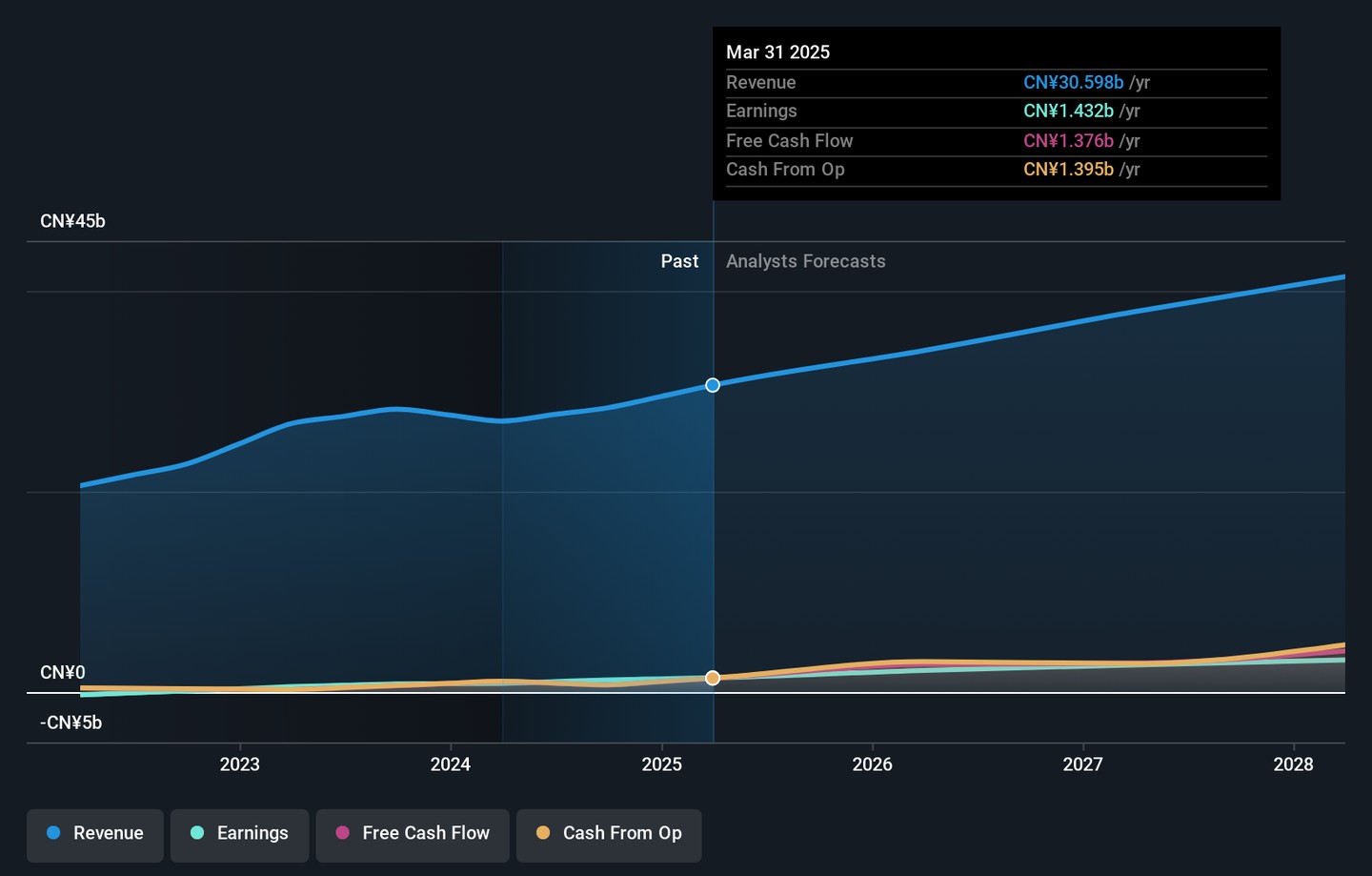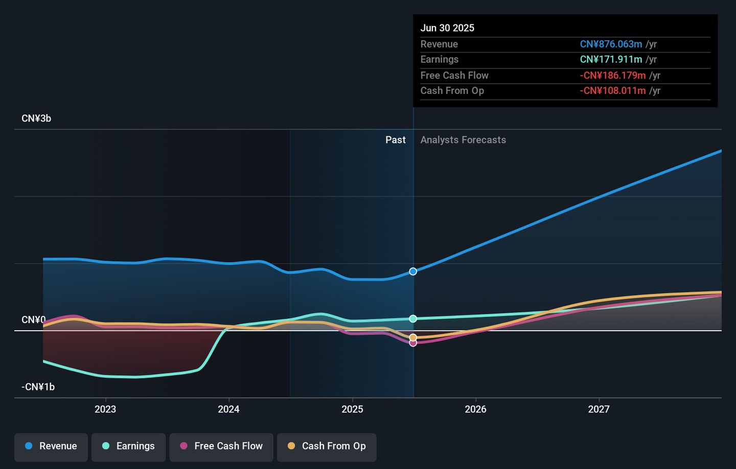 Doushen (Beijing) Education & Technology shows strong growth prospects with forecasted annual earnings and revenue increases of 43% and 42.8%, respectively, outpacing the Chinese market averages. Recent earnings for the half year ended June 30, 2025, indicate significant sales growth to CNY 445.72 million from CNY 326.39 million a year ago, alongside improved net income. Despite high non-cash earnings impacting quality metrics, insider ownership remains a key factor in its strategic direction.