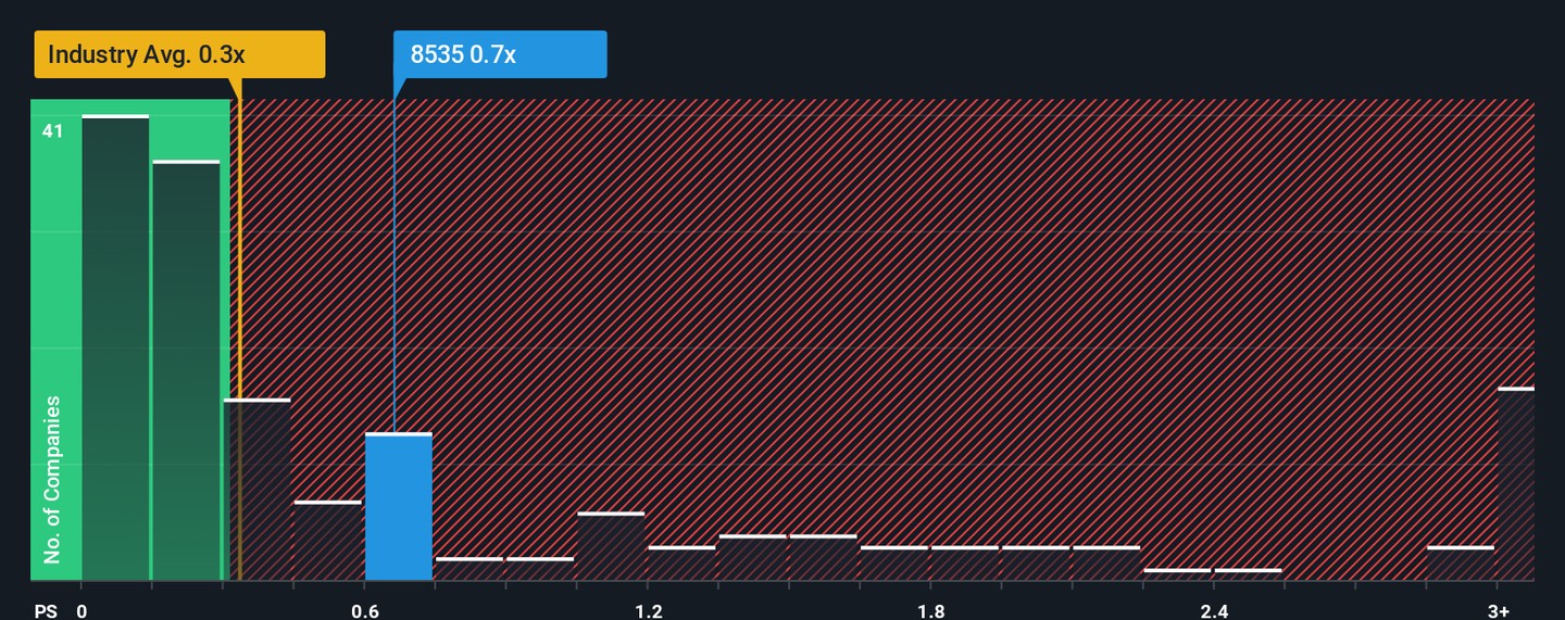Vistar Holdings Limited (HKG:8535) has seen a 54% surge in share price over the last month, adding to a 278% increase over the past year. Despite this, the company's price-to-sales (P/S) ratio of 0.7x is higher than the industry median of 0.3x, raising concerns given the company's 12% revenue decline over the past year and 32% over three years. Investors may be overly optimistic about a turnaround, as the industry is expected to grow by 17% next year. Caution is advised as the current P/S may not reflect the company's poor growth performance.