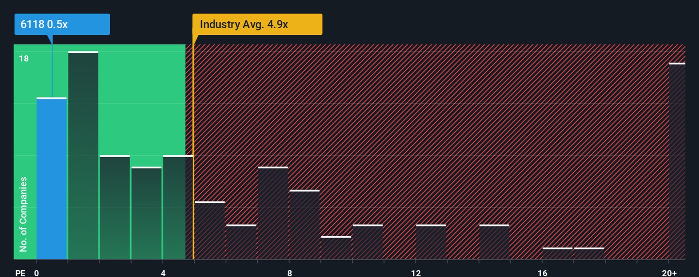 In spite of the firm bounce in price, Austar Lifesciences' price-to-sales (or "P/S") ratio of 0.5x might still make it look like a strong buy right now compared to the wider Life Sciences industry in Hong Kong, where around half of the companies have P/S ratios above 6x and even P/S above 9x are quite common. Nonetheless, we'd need to dig a little deeper to determine if there is a rational basis for the highly reduced P/S.