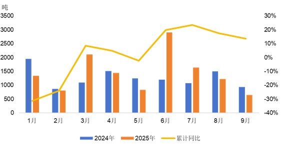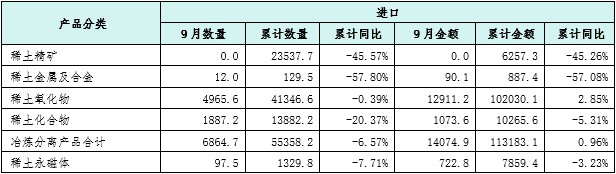 In terms of import quantity, from January to September, China imported a total of 23,500 tons of rare earth concentrates, a year-on-year decrease of 45.6%. The import volume of rare earth concentrates from the United States accounted for 99.3% of China's total rare earth concentrate imports. After MP Materials in the U.S. announced the suspension of rare earth concentrate exports in April, there were no exports of rare earth concentrates to China in June, August, and September; the total import of rare earth smelting separation products was nearly 55,000 tons, a year-on-year decrease of 6.6%, of which the total import of rare earth metals and alloys was about 129.5 tons, a year-on-year decrease of 57.8%; the total import of rare earth oxides was 41,000 tons, a year-on-year decrease of 0.4%; the total import of rare earth compounds was about 14,000 tons, a year-on-year decrease of 20.4%; and the total import of rare earth permanent magnet materials was 1,329.8 tons, a year-on-year decrease of 7.7%.