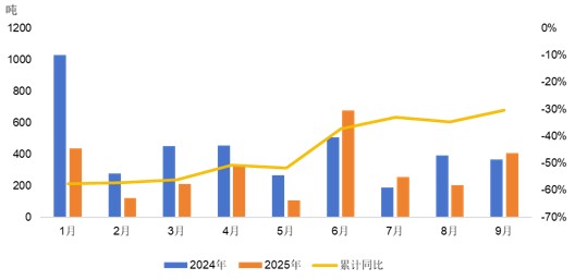 By product, the rare earth permanent magnet products containing terbium and dysprosium are most affected by export control policies. From January to September, China's cumulative export volume of rare earth permanent magnet products to the U.S. was 4,141.8 tons, a year-on-year decrease of 24.0%. Overall, although the trade situation between China and the U.S. eased in the third quarter compared to the second quarter, with a quarter-on-quarter increase of 152.4% in magnet material exports, it still decreased by 12.2% compared to the same period last year.