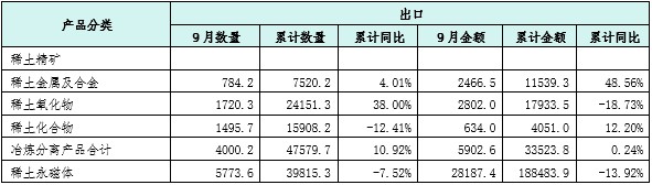From January to September, China exported approximately 17,000 tons of rare earth products to the United States, a year-on-year increase of 1.5%. Among them, the export of rare earth smelting and separation products to the United States was 13,000 tons, a year-on-year increase of 14.0%; the export of magnetic materials to the United States was 4,142 tons, a year-on-year decrease of 24.4%