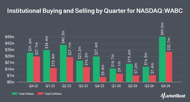 A number of other hedge funds and other institutional investors have also bought and sold shares of WABC. Envestnet Asset Management Inc. grew its holdings in shares of Westamerica Bancorporation by 4.5% during the first quarter. Envestnet Asset Management Inc. now owns 8,325 shares of the financial services provider's stock valued at $421,000 after buying an additional 362 shares during the last quarter. Allworth Financial LP grew its holdings in shares of Westamerica Bancorporation by 13.0% during the first quarter. Allworth Financial LP now owns 4,426 shares of the financial services provider's stock valued at $214,000 after buying an additional 510 shares during the last quarter. MIRAE ASSET GLOBAL ETFS HOLDINGS Ltd. grew its holdings in shares of Westamerica Bancorporation by 4.4% during the first quarter. MIRAE ASSET GLOBAL ETFS HOLDINGS Ltd. now owns 15,261 shares of the financial services provider's stock valued at $773,000 after buying an additional 642 shares during the last quarter. US Bancorp DE grew its holdings in shares of Westamerica Bancorporation by 19.9% during the first quarter. US Bancorp DE now owns 4,698 shares of the financial services provider's stock valued at $238,000 after buying an additional 780 shares during the last quarter. Finally, State of Alaska Department of Revenue grew its holdings in shares of Westamerica Bancorporation by 5.3% during the second quarter. State of Alaska Department of Revenue now owns 15,579 shares of the financial services provider's stock valued at $753,000 after buying an additional 780 shares during the last quarter. Hedge funds and other institutional investors own 81.89% of the company's stock.