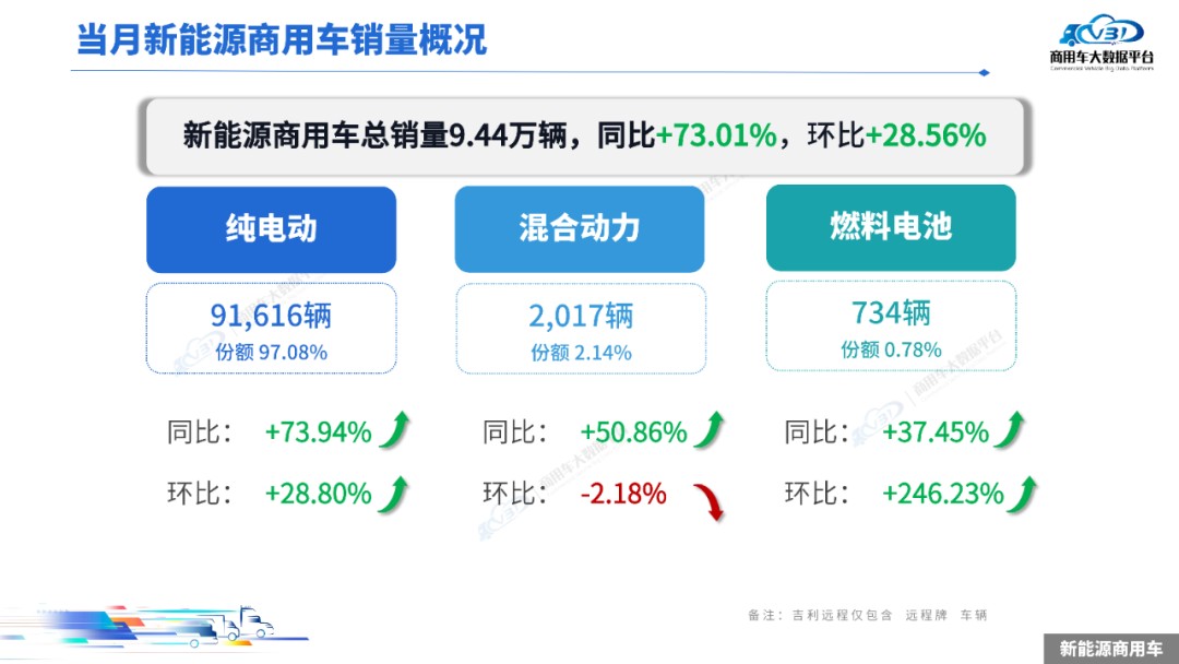 In terms of type, the sales of new energy trucks were 54,800 units, accounting for 58.12%, with a year-on-year increase of 95.52% and a month-on-month increase of 16.03%; the sales of new energy buses were 39,500 units, accounting for 41.88%, with a year-on-year increase of 49.18% and a month-on-month increase of 51.22%.