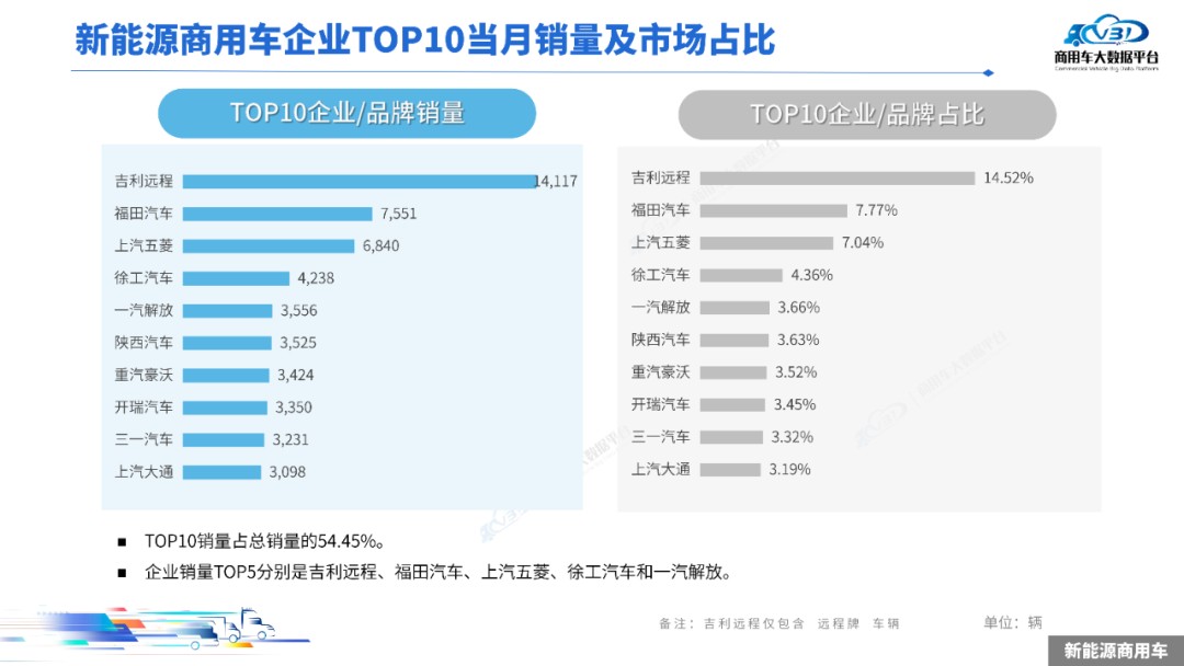 From the perspective of enterprise/brand performance, the top 5 enterprises/brands accounted for 37.35% of sales, namely Geely Yuanchen, Foton Motor, SAIC-GM-Wuling, XCMG, and FAW Jiefang.