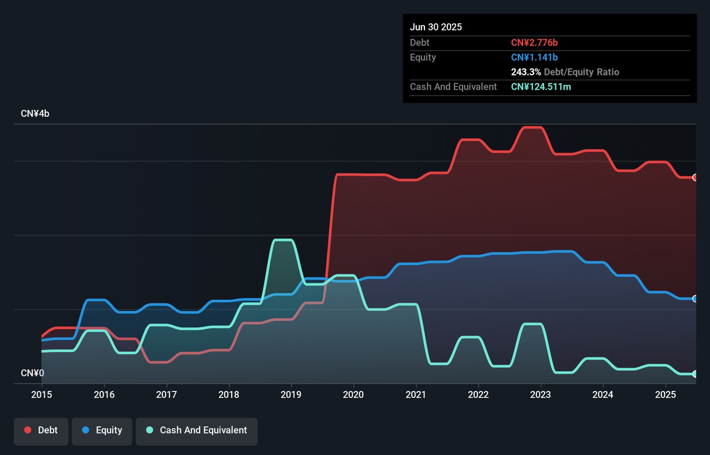 Chen Xing Development Holdings (HKG:2286) carries significant debt, with CN¥2.78b in liabilities and a net debt of CN¥2.65b after accounting for cash reserves. The company's balance sheet shows a concerning deficit of CN¥6.92b against its cash and receivables. With a revenue decline of 81% and an EBIT loss of CN¥126m, the financial outlook appears risky. Analysts express caution, highlighting the need for potential recapitalization and warning of four significant risks associated with the stock.