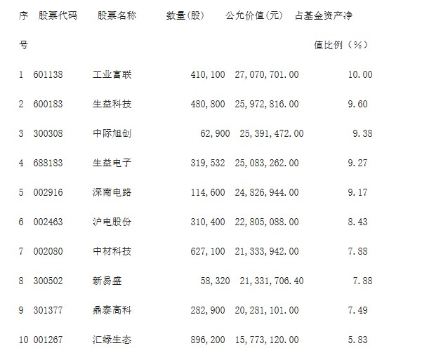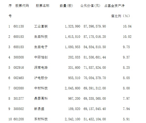 As of the end of the third quarter, the top ten heavy holdings of this fund were Industrial Fulian (601138.SH), Sytech (600183.SH), Sytech Electronics (688183.SH), Zhongji Xuchuang (300308.SZ), Shenzhen South Circuit (002916.SZ), Huadian Co., Ltd. (002463.SZ), China National Materials Technology (002080.SZ), Dingtai Gaoke (301377.SZ), Xinyi Sheng (300502.SZ), and Dongcai Technology (601208.SH).