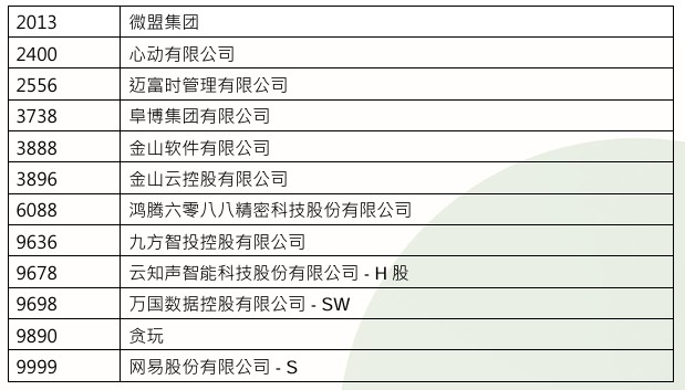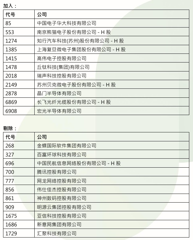 In addition, the number of constituent stocks in the Hang Seng Semiconductor Industry Theme Index will be reduced from 45 to 33, with the addition of 11 stocks including CE HUADA TECH (00085) and Baker Hughes (02149); 23 stocks including China Civil Aviation Information Network (00696) and Tencent Holdings (00700) will be removed.