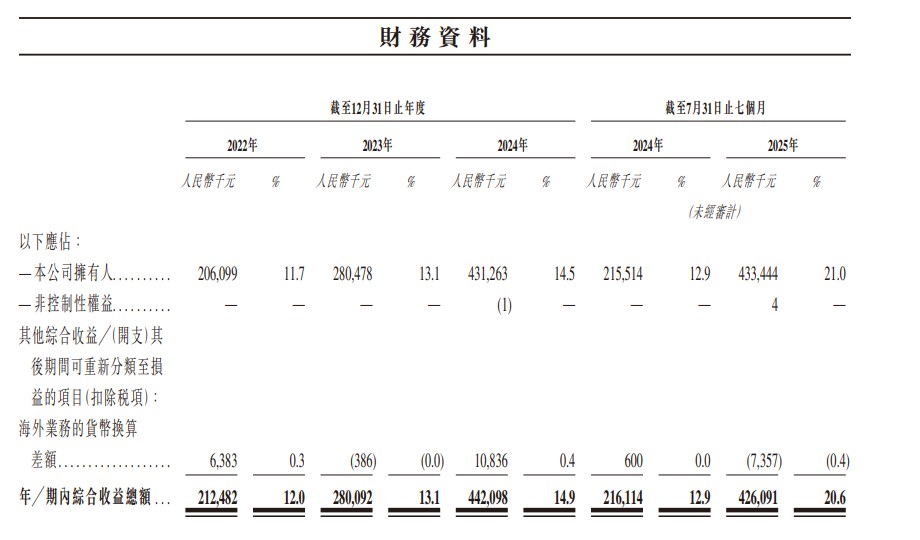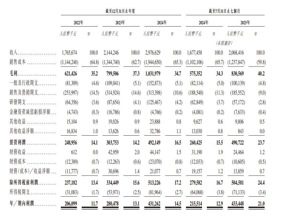 In terms of performance, the company's revenue for the years ending December 31, 2022, 2023, and 2024, as well as for the seven months ending July 31, 2024, and 2025, were RMB 1,765.7 million, RMB 2,144.2 million, RMB 2,976.6 million, RMB 1,677.5 million, and RMB 2,068.4 million, respectively