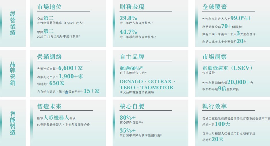 The prospectus shows that the company is a global leader dedicated to providing outdoor leisure and electric mobility solutions. According to Frost & Sullivan, the company ranks second in the global electric low-speed vehicle industry by revenue in 2024, with a global market share of approximately 8.4%. The company offers innovative solutions that combine entertainment and practicality through an industry-leading diversified product portfolio. Its business covers two major segments: (1) electric mobility products, including (i) electric low-speed vehicles that meet the growing demand for short-distance travel in communities and venues, and (ii) electric two-wheelers, including electric bicycles, electric scooters, and electric balance bikes; and (2) outdoor specialty vehicles, also known as powered sports, including all-terrain vehicles and off-road motorcycles. These products are widely used in community short-distance commuting, recreational sports, smart mobility, and special operation scenarios. Based on its deep technological foundation, the company is actively expanding into cutting-edge fields such as humanoid robots, aiming to open up new long-term growth avenues.