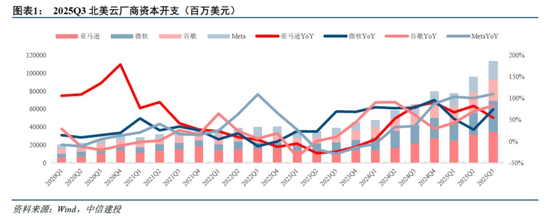 The four CSP manufacturers in North America have successively announced their third-quarter reports, with capital expenditures accelerating growth, and all companies maintaining a positive attitude towards future infrastructure investments. The total capital expenditures of the four major cloud manufacturers in North America for Q1 2025 amounted to $77.3 billion, a year-on-year increase of 62%. For Q2 2025, total capital expenditures reached $95.8 billion, a year-on-year increase of 64%. In Q3 2025, the total capital expenditures of the four CSP manufacturers in North America amounted to $113.3 billion, a year-on-year increase of 75%, and a quarter-on-quarter increase of 18%.