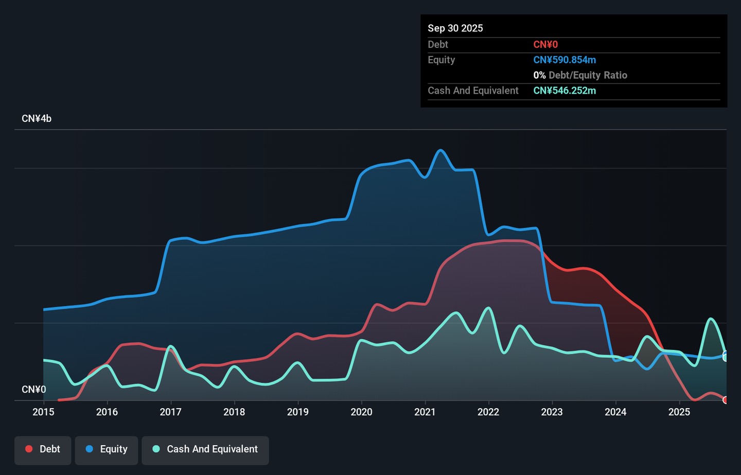 Hangzhou Century Co., Ltd., with a market cap of CN¥3.98 billion, remains unprofitable despite reporting sales of CN¥603.82 million for the nine months ended September 30, 2025, and reducing its net loss to CN¥4.76 million from a much larger loss the previous year. The company benefits from being debt-free and having short-term assets exceeding both short-term and long-term liabilities, providing financial stability in the near term. However, challenges include an inexperienced management team with an average tenure of less than one year and ongoing losses that have increased by over 21% annually over five years.