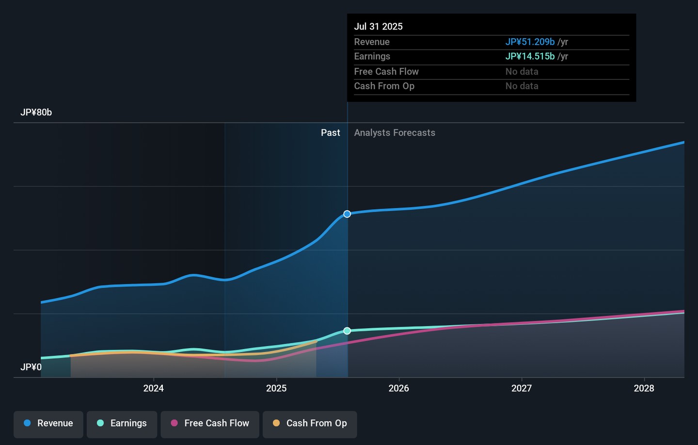 ANYCOLOR Inc. has demonstrated a robust financial trajectory, revising its earnings guidance upward due to successful VTuber anniversary initiatives and merchandise strategies that boosted engagement and revenue. With an annualized revenue growth forecast at 12.3% and earnings expected to rise by 11.6% per year, the company is outpacing the Japanese market's average. Particularly notable is ANYCOLOR's R&D commitment, which remains integral as they continue innovating in the digital entertainment space—a sector driven by dynamic content creation and audience interaction trends. This strategic focus not only enhances their market position but also aligns with broader industry shifts towards immersive digital experiences, suggesting promising prospects for sustained growth.