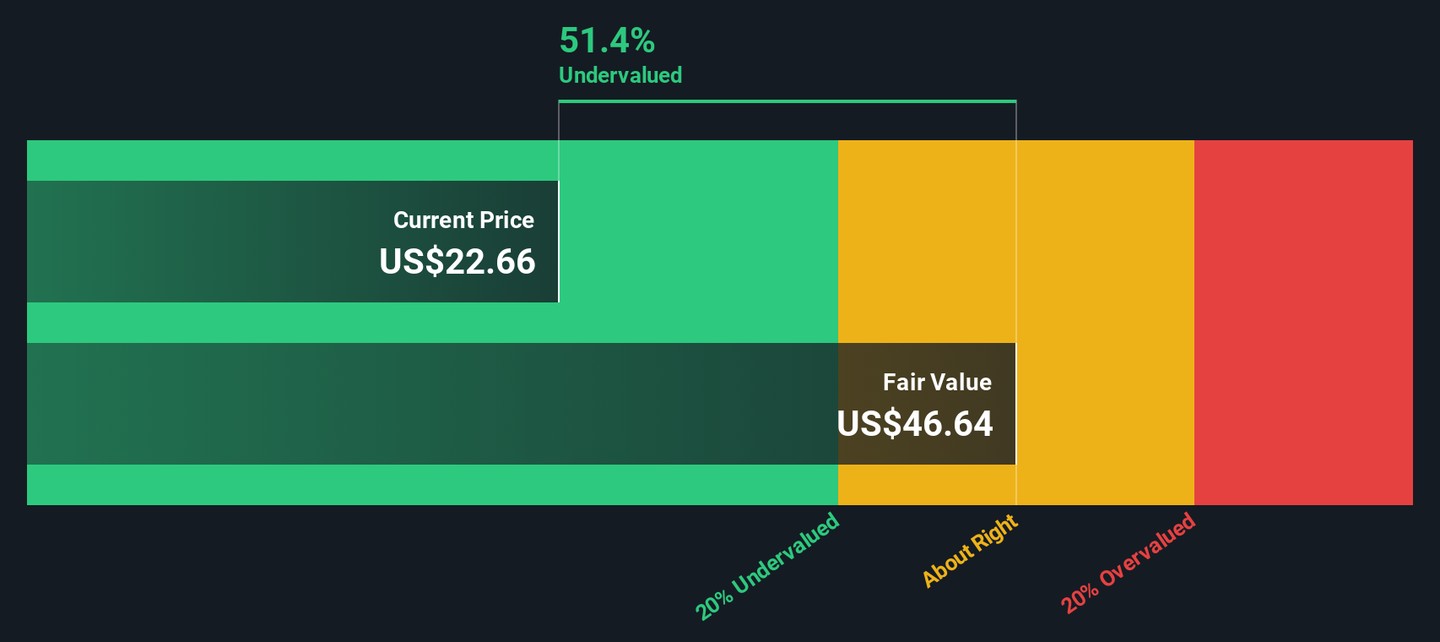 While the earnings multiple points to overvaluation, our SWS DCF model paints a surprisingly different picture. Based on future cash flows, First Busey’s shares are trading at a steep 51% discount to estimated fair value. This suggests they may actually be undervalued. Does this gap signal an overlooked opportunity, or is the market rightly skeptical?